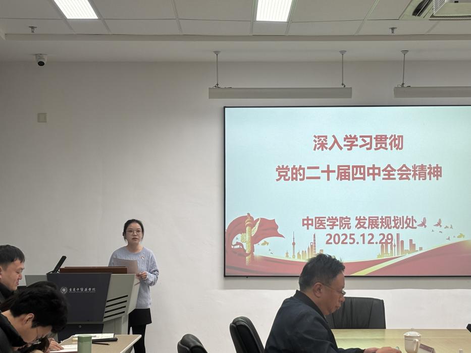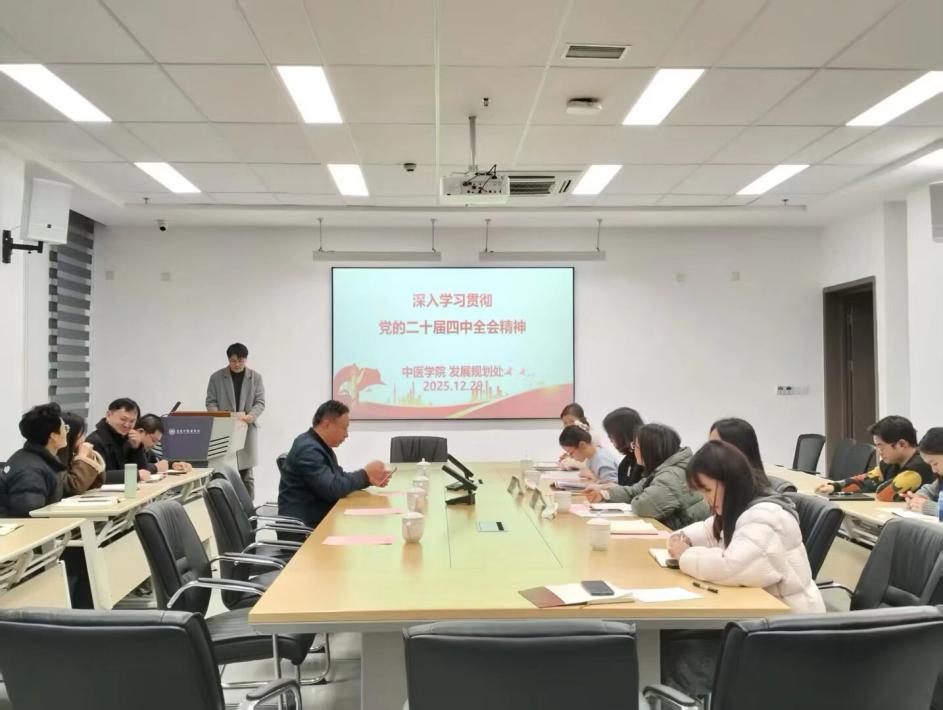 为深刻领会党的二十届四中全会精神实质,切实把思想和行动统一到党中央决策部署上来,2025年12月29日,校党委常委、副院长吴斌在中医学院B4-311会议室开展学习贯彻党的二十届四中全会精神专题学习会。会议由中医学院党总支副书记姚玲主持,发展规划处(学位办)支部全体成员及中医学院全体教职工参加会议。
