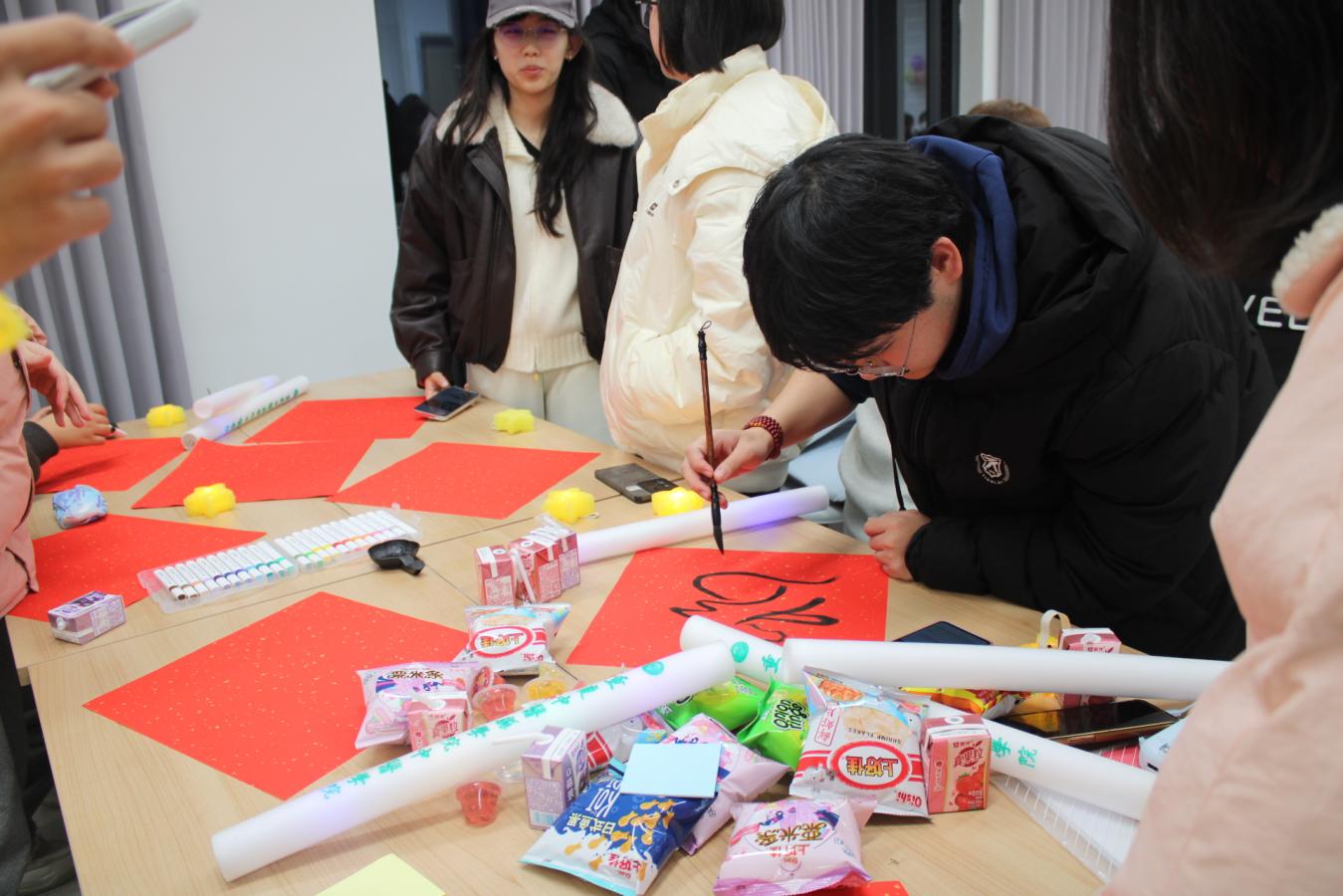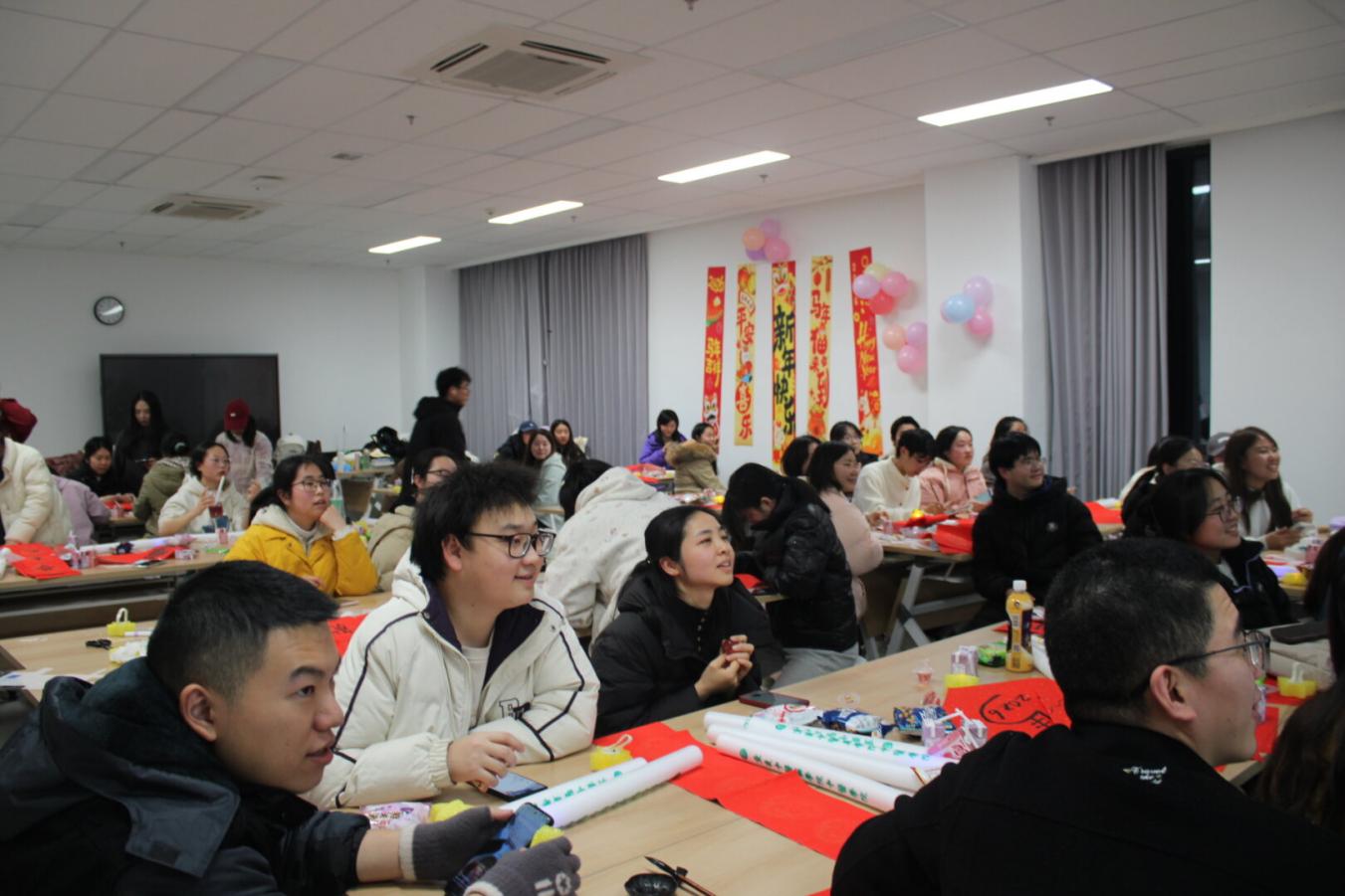 本次茶话会中,“时光回眸:2025成长印记”环节邀请同学分享了成长故事,定格年度闪光记忆。“笔墨寄情:2026年愿景”环节通过书写福字、春联及制作心愿热缩片,寄托新年期盼。在“欢聚今宵”部分,精彩才艺展示后,陆续开展了“emoji猜词”“动作传话筒”“猜歌挑战”等互动游戏,现场气氛热烈,积分卡机制贯穿始终。最终,“星光夺宝积分拍卖会”将活动推向高潮,同学们凭借所得积分竞拍神秘奖品,为茶话会画上圆满句号。