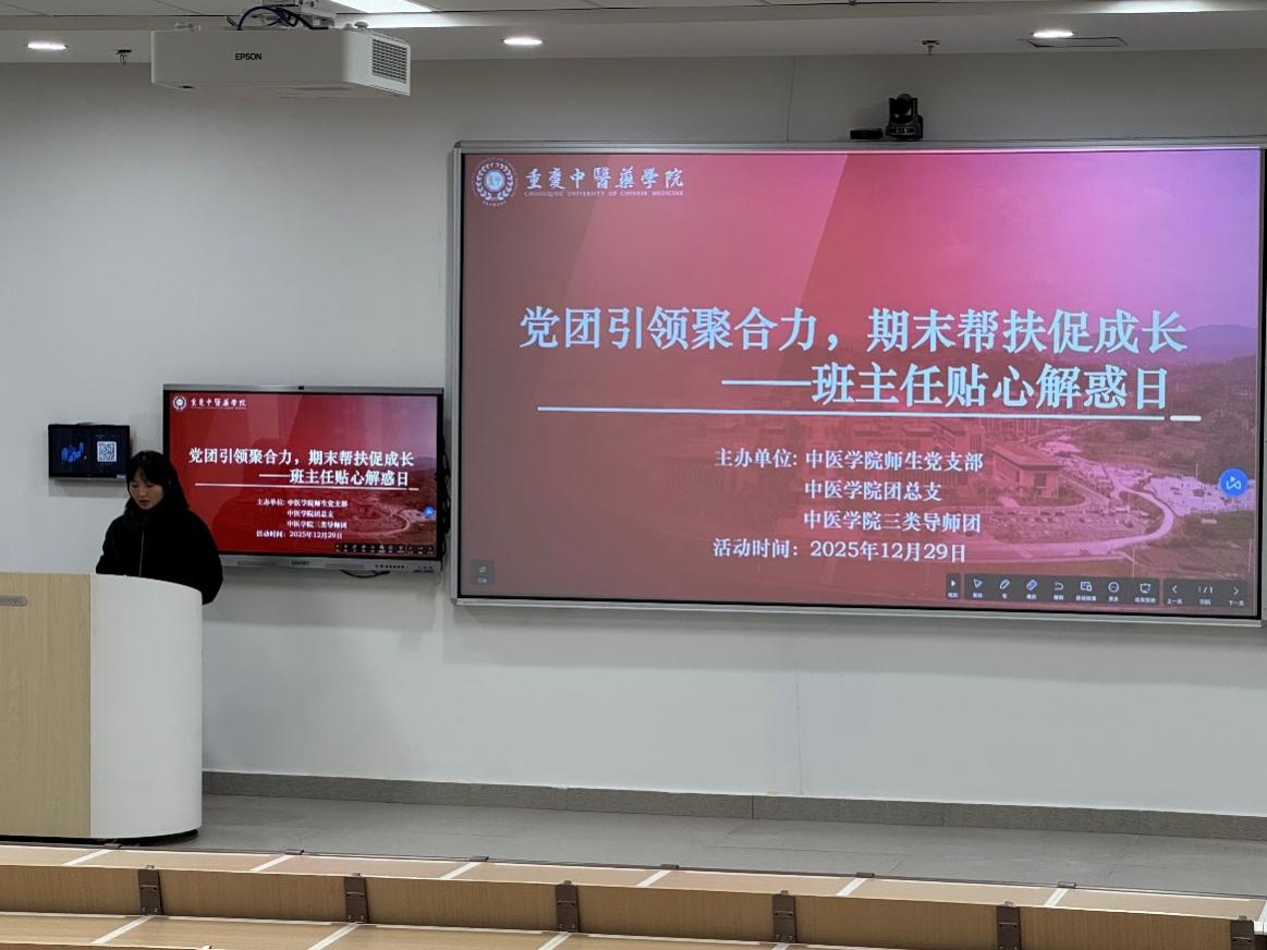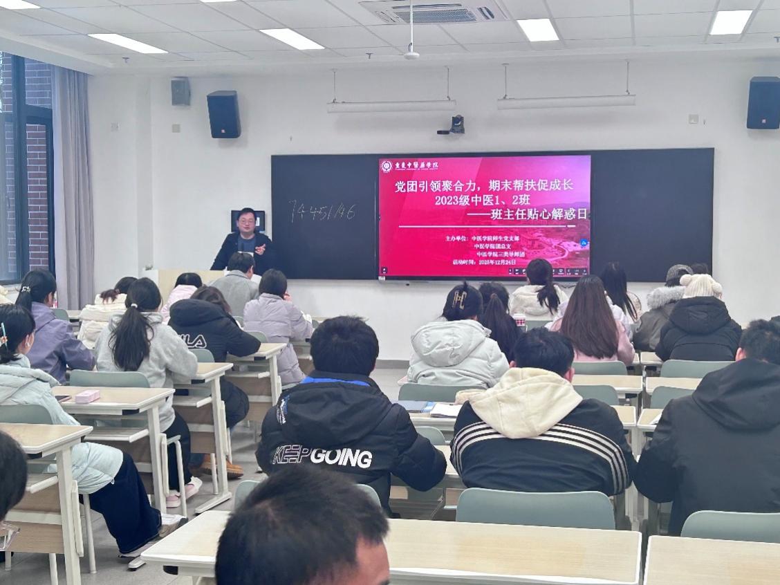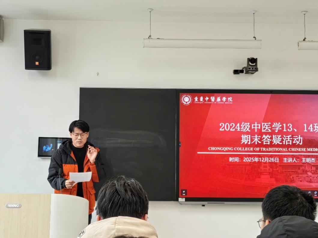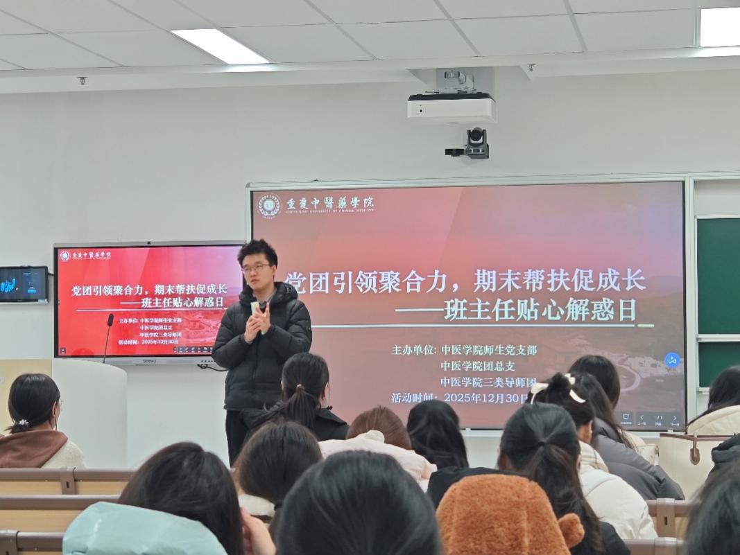 为切实发挥党团组织纽带作用与三类导师育人功能,助力全院学生高效备战期末,中医学院于2025年12月集中组织开展期末班主任暖心答疑活动。活动覆盖全院所有班级,各班主任以线下专题班会为载体,聚焦中医专业核心课程梳理知识重难点、解析典型例题,同时分享科学复习策略与时间管理技巧,并同步开展考前心理疏导,为学子送上精准化、全方位的备考支持。