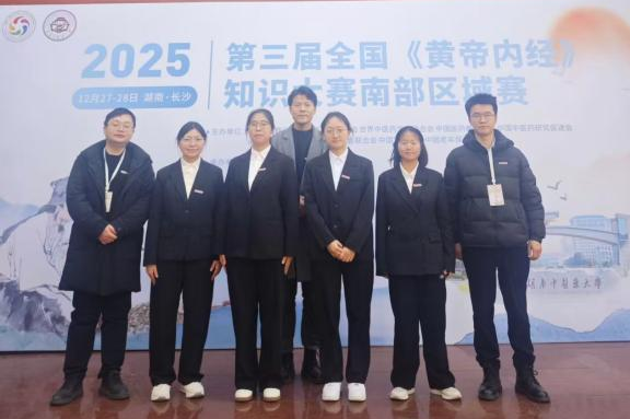 2025年12月28日,第三届全国《黄帝内经》知识大赛南部区域赛在湖南中医药大学圆满落幕。本次赛事覆盖重庆、广东等6省共26支队伍,我院4位参赛选手—2024级中医学专业石梦灵和2023级中医学专业王冰艳、周亮、严晴月,在经典教研室熊为锋、李全鑫两位指导老师和带队老师科教科王明杰科长的率领下,凭借扎实的经典功底,成功斩获团体三等奖。