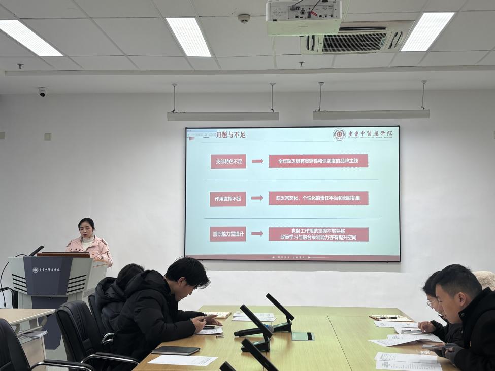 2026年1月23日下午14:30,为全面检验2025年度各党支部党建工作成效,压实党支部书记抓党建第一责任人职责,中医学院党总支在B4-311会议室召开了2025年度党支部党建工作考核和党支部书记抓党建工作述职评议考核会。此次会议由学院党总支秘书王凤娇同志主持,各党内委员、各支部书记及党员代表参加、学院副院长(主持工作)杨成、副院长李艳列席。