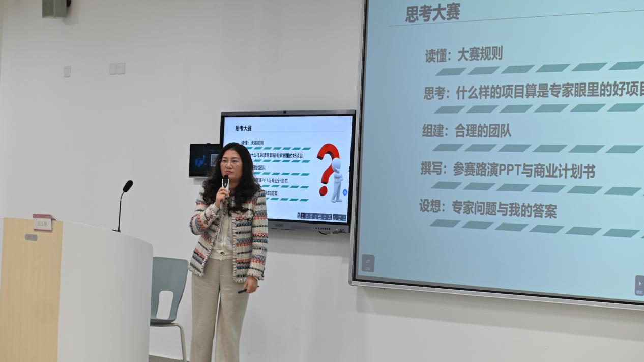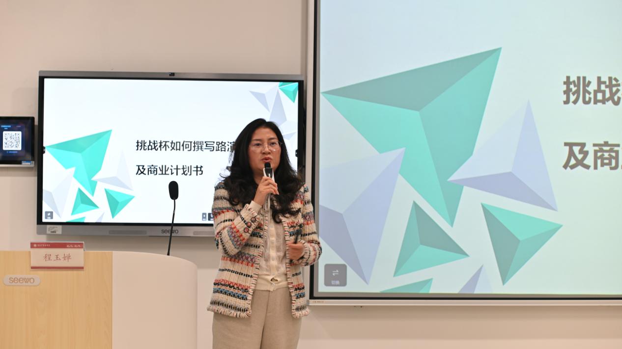 程玉婵老师围绕“挑战杯”创业计划竞赛开展全流程指导,聚焦创新、实践、社会价值等维度,强调项目需立足真实痛点,扎实调研市场行情。同时,程老师围绕核心竞争壁垒构建、多元化盈利模式设计、财务融资规划规范、赛事答辩技巧提升等关键内容进行专题讲解与系统辅导,为参赛项目从校级赛事冲刺国家级赛事夯实基础、提供坚实支撑。