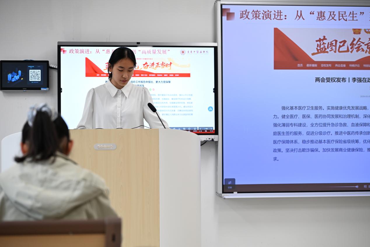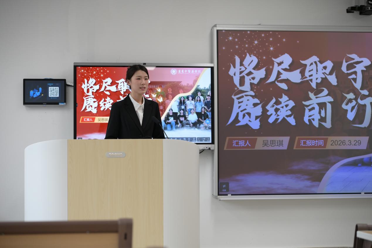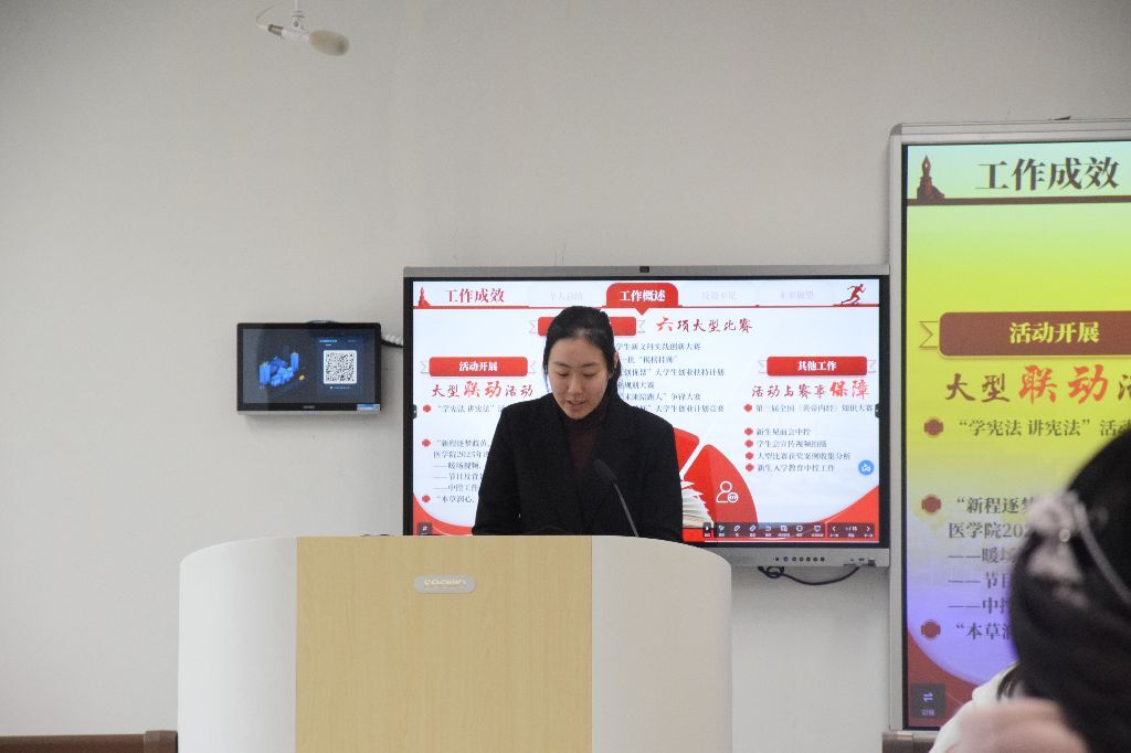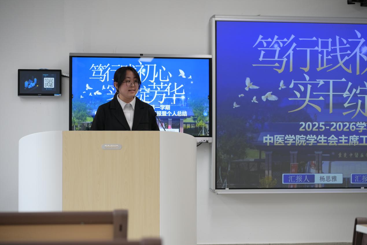 在理论学习环节,会议紧扣中医药政策从“惠及民生”向“高质量发展”演进变化,深化学生对国家战略的理解,进一步增强文化自信与使命担当,厚植中医药文化传承根基。在工作述职环节,中医学院团总支、学生会主席团成员和各部门部长依次汇报2025-2026学年第一学期工作成效,充分展现了学生组织在服务同学、推动中医药文化传播中的积极作为与责任担当。