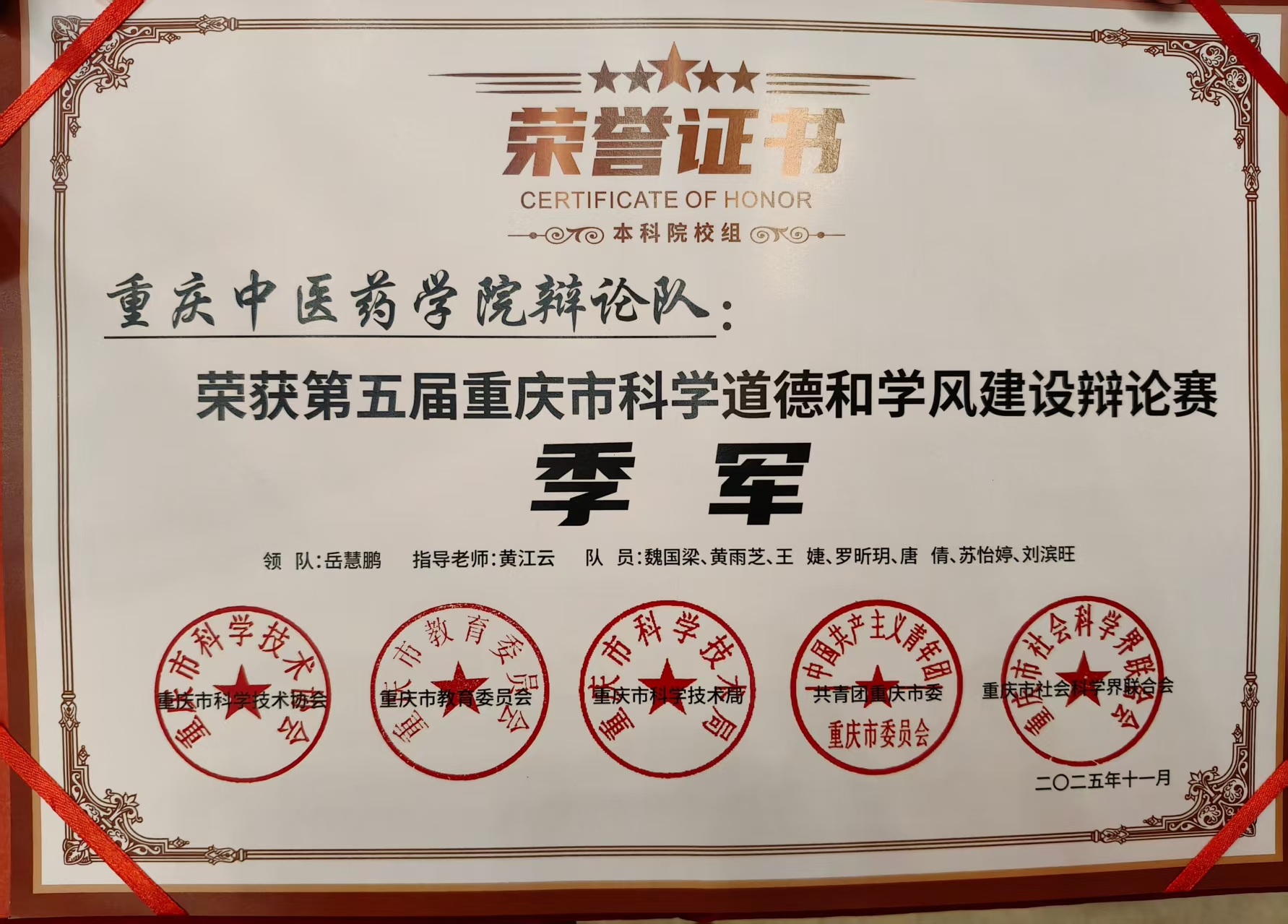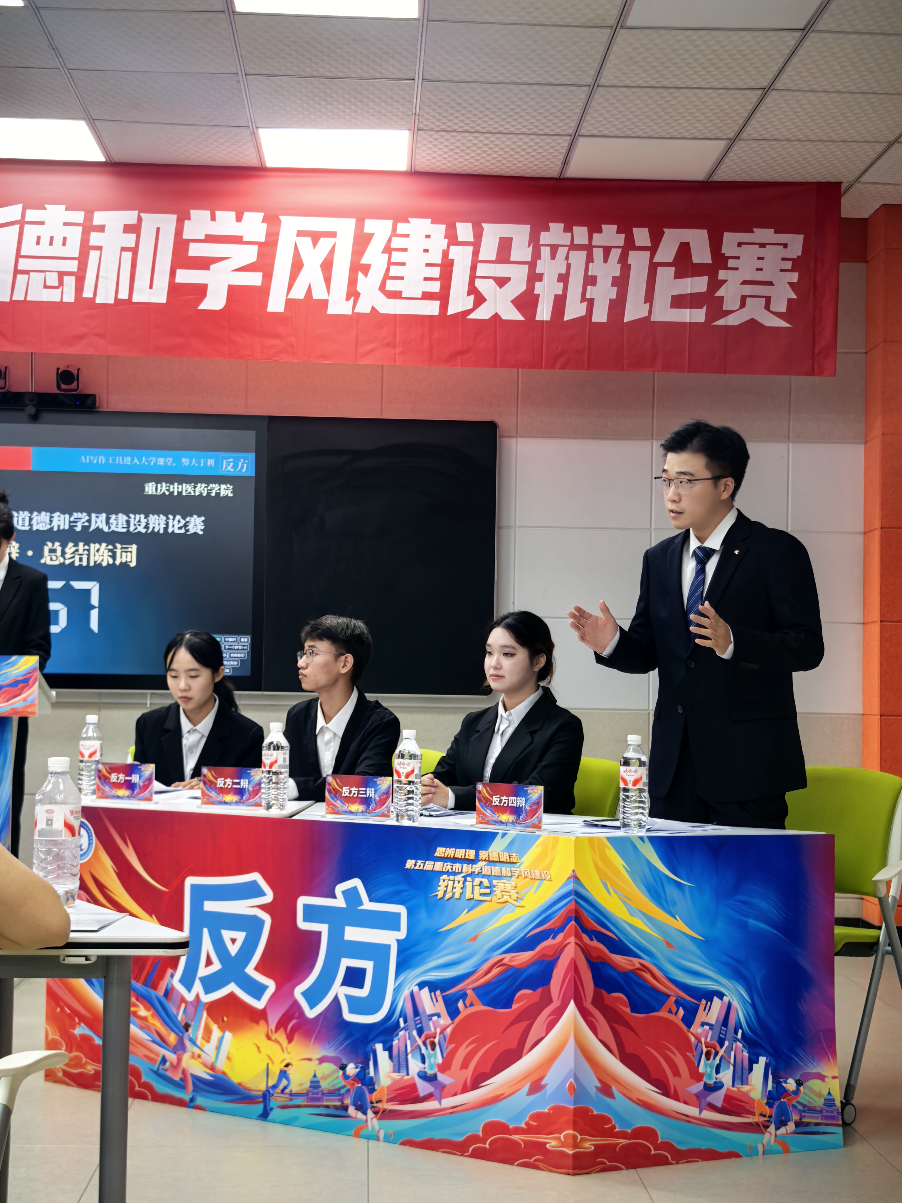 近日,由市科协、市教委、市科技局、团市委、市社科联联合举办的第五届重庆市科学道德和学风建设辩论赛圆满落幕。我校岐黄论道辩论队作为首次参赛队伍,表现卓越,一路过关斩将,成功挺进半决赛,最终荣获重庆市季军的优异成绩。中药学院辅导员魏国梁老师作为队伍中不可或缺的在编青年教师成员,全程参与比赛,为团队贡献了重要力量。