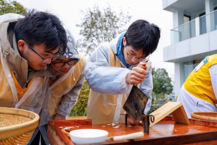 17日上午,在药用植物园寻药环节,随着发令信号响起,大盘山药用植物园内瞬间掀起寻药热潮。队员们穿梭在红黄交织的草木间,时而蹲身细致观察,时而轻嗅花果气味,时而低声交流辨析要点。他们将课堂知识精准转化为实操能力,在规定时间内高效完成识别与记录工作。当天下午的非遗文化实操竞赛现场,队员们再度展现过硬本领。在切白芍、炒白术两个核心环节中,队员们手握刀具稳准起落,将白芍切成规定的均匀薄片;执掌铁铲精准控火,让白术在翻炒中逐渐散发出醇厚药香。