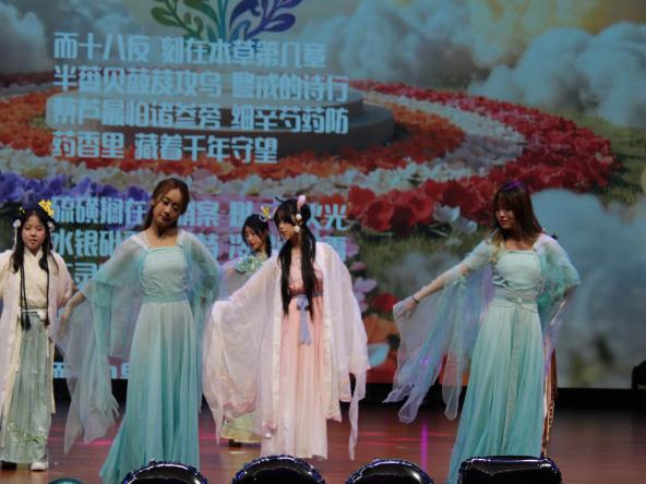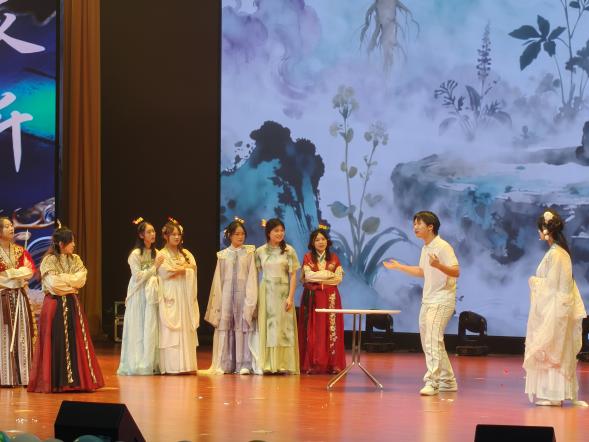 中医药文化,在舞台上诉说千年传承。乐队深情演绎的《凄美地》,以细腻唱腔勾勒出深沉情愫,让观众在旋律中感受别样的情感共鸣;话剧《本草镜》独具匠心,将“十八反十九畏”的中医药智慧融入生动剧情,以戏剧之名解码本草的“相处之道”,照见中医药的严谨与传承;少数民族同学带来的彝族歌曲《不要怕》,温柔又坚定的歌声如暖心良方,驱散迷茫不安,给予现场观众直面未知的勇气;舞蹈《千年》以敦煌古韵为骨,水袖翻飞间流转千年时光,用翩跹舞姿演绎跨越时空的执着与守候,尽显华夏美学的浪漫;分子生药学教研室和同学组成的学习小组带来的合唱《崇拜》,将对坚守初心的先辈、对勇敢追梦的自己的敬意娓娓道来,细腻动人。中场“花落药院”抽奖环节惊喜连连,笑声与掌声交织,让现场温情满满。