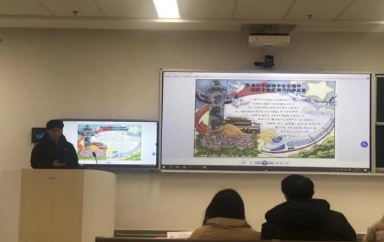 本次大赛评审团由学院学生工作办公室辅导员李士家、江雪莲,综合办公室袁建丹老师及党员服务站主席曾萍、庹静联合组成,从主题契合度、内容准确性、创意设计、绘画技巧及整体视觉效果等多维度进行专业评审。与传统赛事不同,决赛创新设置开放式展演与创作者讲解环节,参赛学生通过 PPT、黑板板书等多样形式,在作品前向评委与观赛师生阐述创作思路与理论思考,让理论学习更具互动性与感染力。