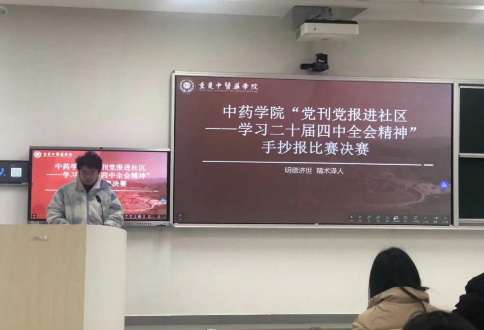 为深入学习贯彻二十届四中全会精神,引导学子深刻领会全会核心要义与实践要求,将个人成长融入国家发展大局,12 月 16 日中午,中药学院在综合教学楼 E3-102 成功举办 “学习二十届四中全会精神,绘就中国式现代化新蓝图” 主题手抄报比赛决赛。