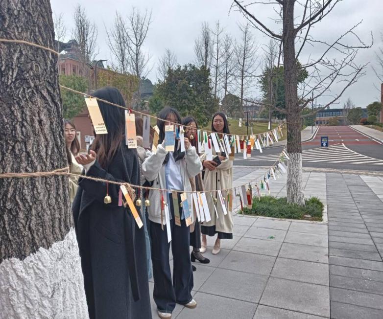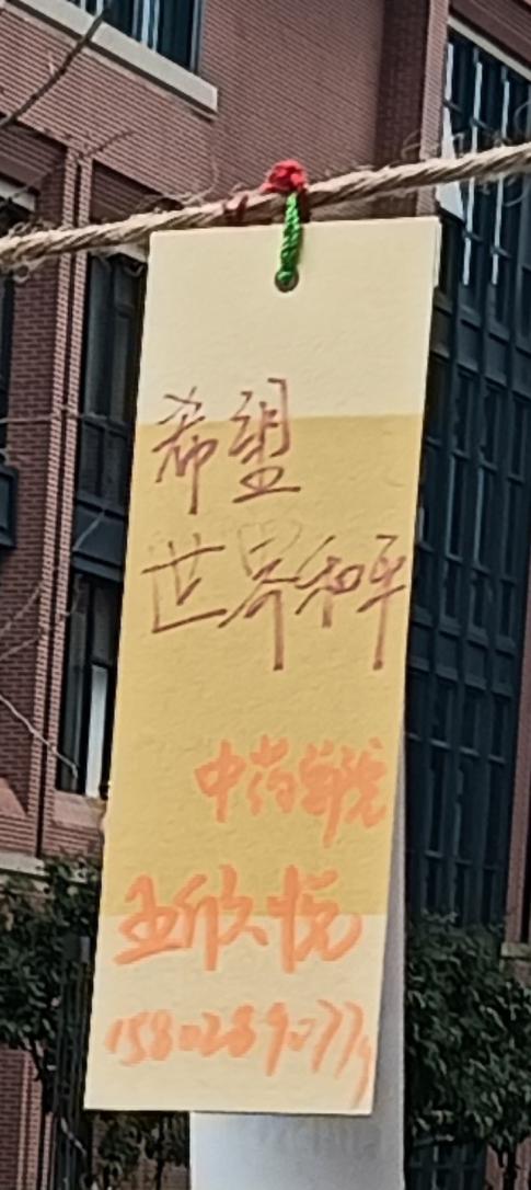 心愿风铃寄期许,一纸书签藏美好。活动现场,串串风铃随风轻摇,吸引了众多同学驻足参与。大家领取精美书签,认真写下心中期许,标注学院与联系方式后,亲手将书签系于风铃绳上。书签上,既有“想喝一杯热奶茶”“拥有一把木吉他”“吃上甜甜的小蛋糕”这类对日常美好的简单向往,也有“希望世界和平”的赤诚心愿,这份心怀天下的期许,对照当下的国际局势,更让大家倍感校园时光的平静珍贵,也让每一个心愿都有了别样的温度。