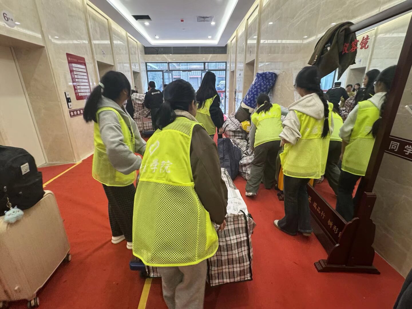 现场分工明确,秩序井然。辅导员们肩扛手提,率先垂范;学生志愿者们身着绿马甲,在楼栋间穿梭往返,接过一件件行李,传递一份份温暖。“这边有新的行李,我来搬!”“别急,慢慢来!”——一句句贴心的话语,一个个忙碌的身影,让搬迁现场不仅有速度,更有温度。师生同心,携手同行,绘就了一幅温馨动人的搬迁画卷。